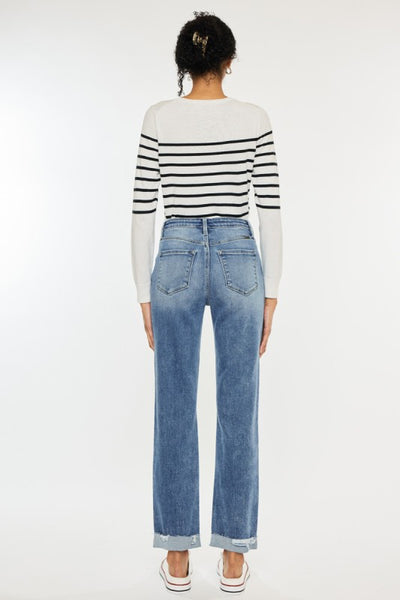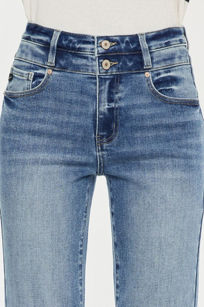This brand is known for it's quality and stretch so you can size down in this pant. Medium wash. Non distressed with raw edge and double button closure.