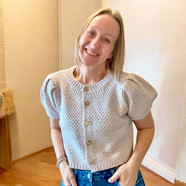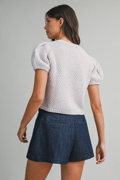 Elevate your wardrobe with this lavender knit cardigan, designed with gracefully pleated puff sleeves and a timeless button-down front. The polished gold accent buttons provide a refined finishing touch, while the short sleeves and quality knit construction offer both comfort and versatility for any occasion.